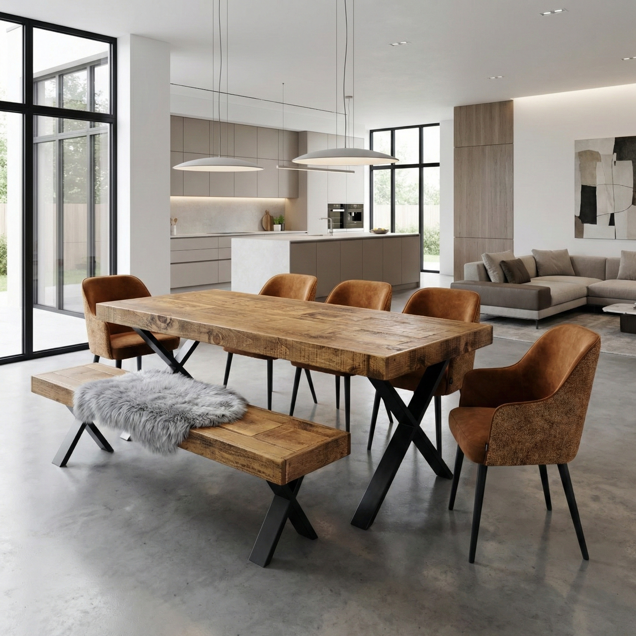 Boston Dining Table Industrial X Frame Steel Legs Rustic Wood – Handmade