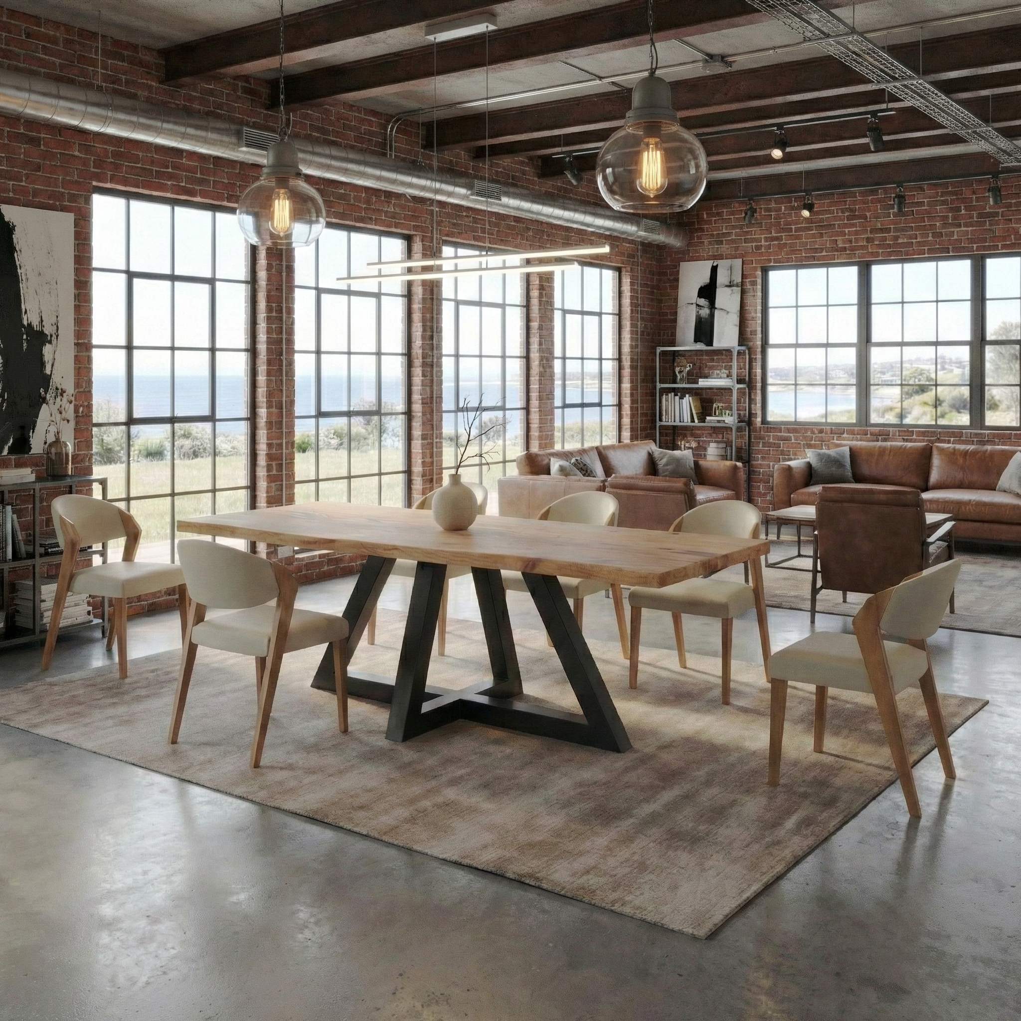 Brigg Dining Table Rustic Solid Wood Triangle Steel Base Industrial Rustic Wood