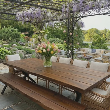 Introducing our meticulously handcrafted Firsby Outdoor Live Edge Dining Bench, a true embodiment of quality and durability. Carefully constructed in our Lincolnshire workshop, this table is a testament to our commitment to using only the finest materials.