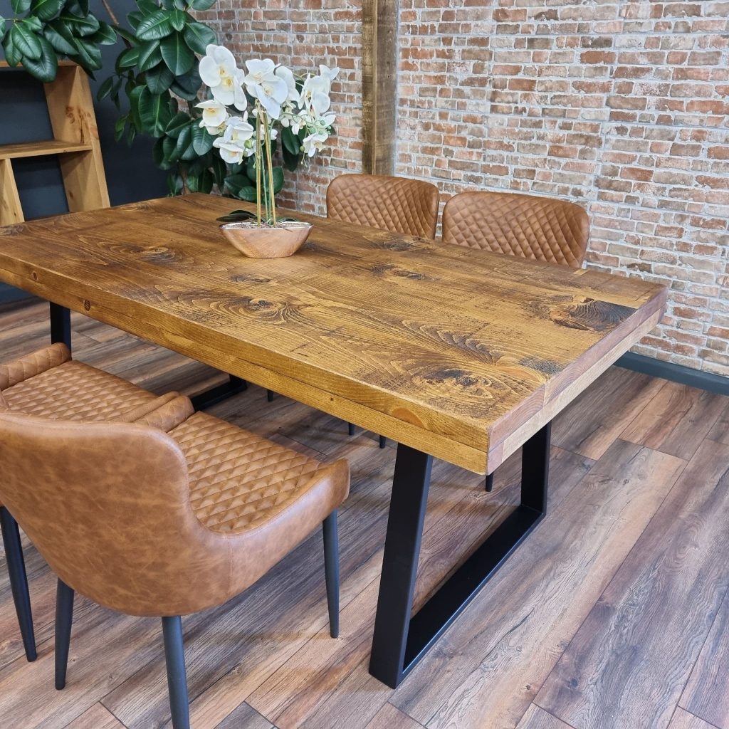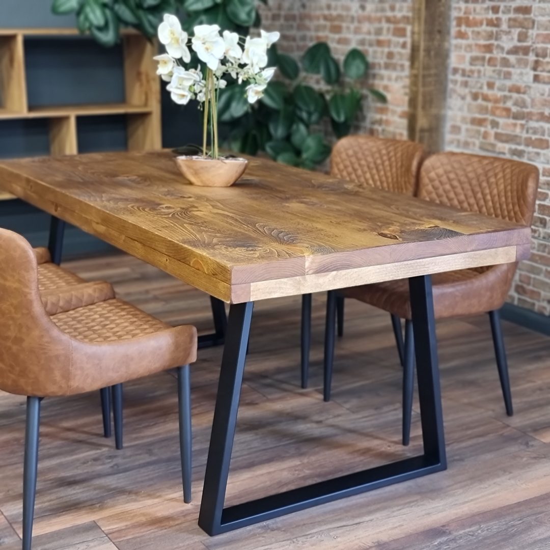 Grantham Rustic Thick Dining Table Industrial Reclaimed. This is our amazing Grantham table, made from Yellow pine with a top of thickness about 4cm, together with a frame underneath the edge of the table, making the table looking thicker, and metal legs.Our tables come protected with a coat of lacquer, this will ensure that you are protected from any stains or messy eaters.These Rustic Dining Tables have been carefully handmade in our Lincolnshire workshop, using only the finest materials.