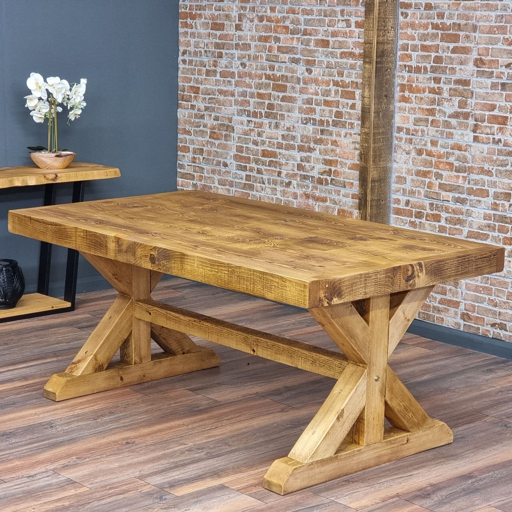 Rustic Farmhouse Clifford Dining Table. Reclaimed Wood – Handmade Kitchen Table X Wooden Base .Our tables come protected with a coat of lacquer, this will ensure that you are protected from any stains or messy eaters.These Rustic Dining Tables have been carefully handmade in our Lincolnshire workshop, using only the finest materials.