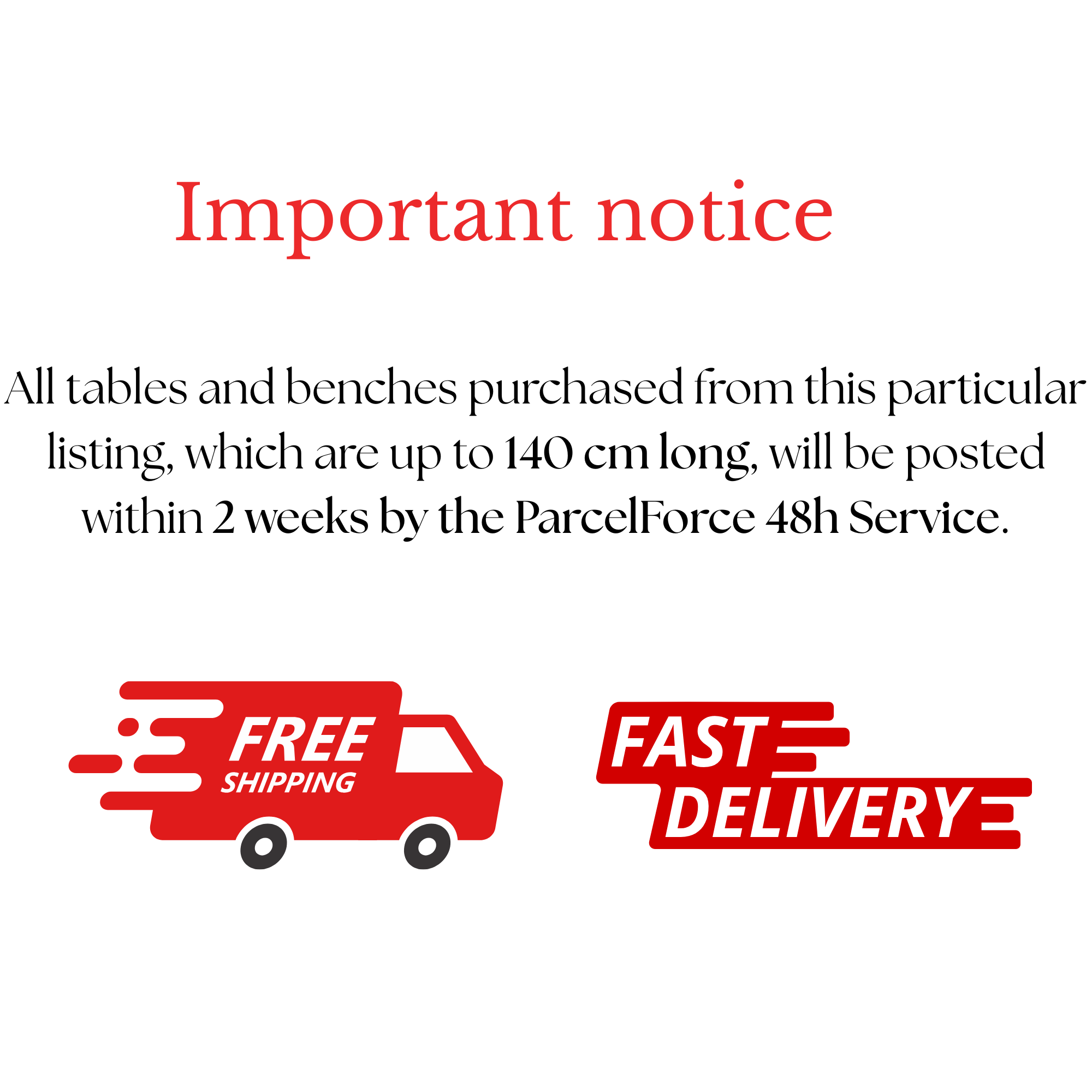 All tables and benches purchased from this particular listing, which are up to 140 cm long, will be posted within 2 weeks by the ParcelForce 48h Service.