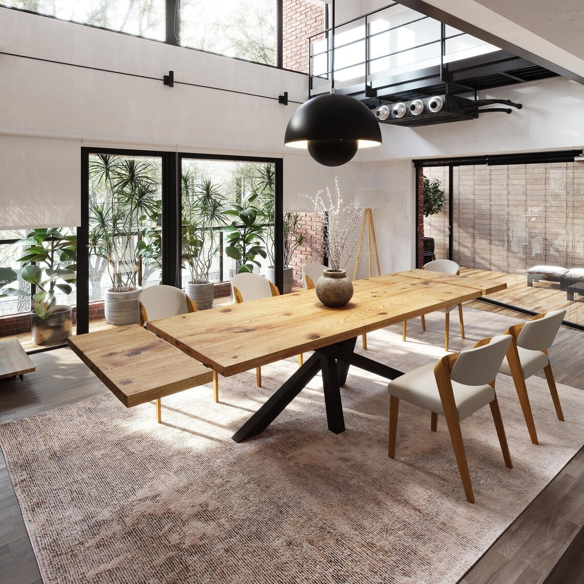 Brigg Dining Table Straight Edge Extendable 2 Sides Dining Table Kitchen Industrial Rustic Wood, Crossover Steel Base