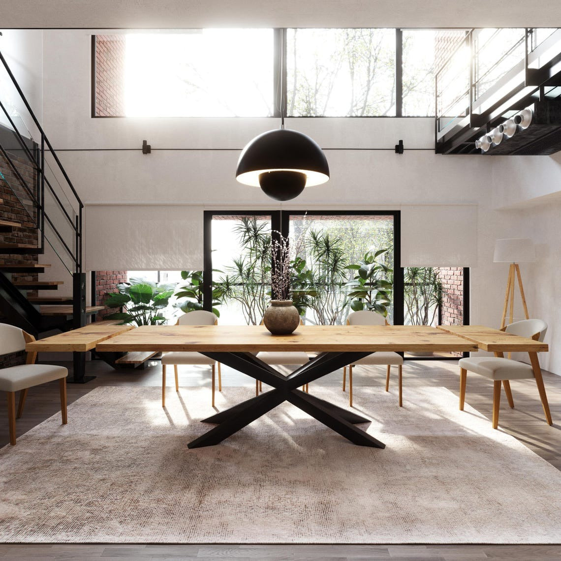 Brigg Dining Table Straight Edge Extendable 2 Sides Dining Table Kitchen Industrial Rustic Wood, Spider Steel Base