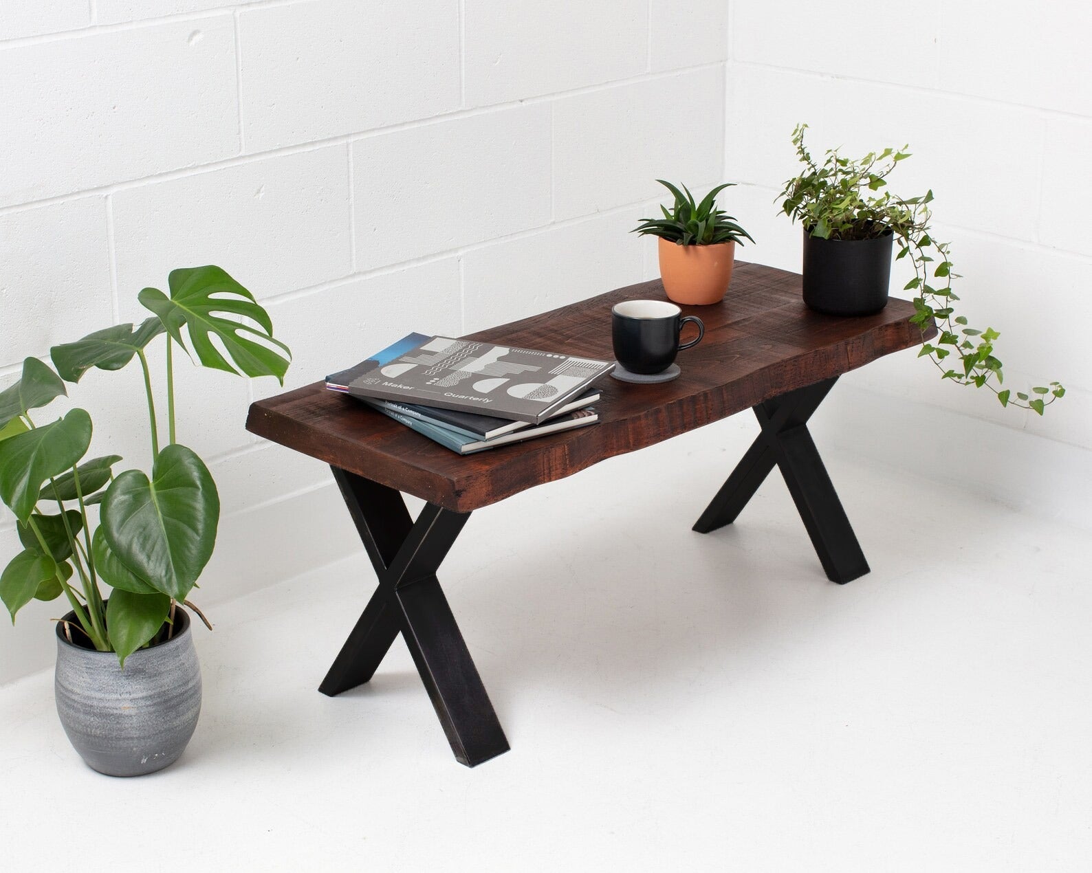 Introducing our Handcrafted Rustic Coffee Table, a true testament to artisanal skill and natural beauty. Supported by bold x-frame legs in black, measuring 700mm by 700mm and with a sleek 20mm profile, this table seamlessly marries contemporary design with rustic allure.