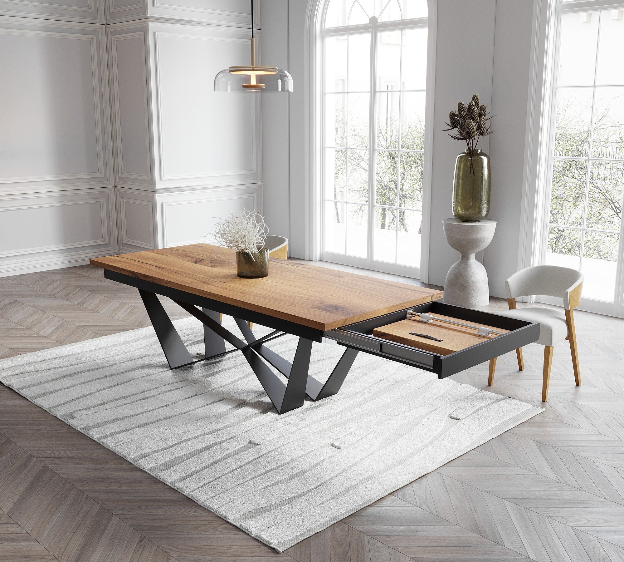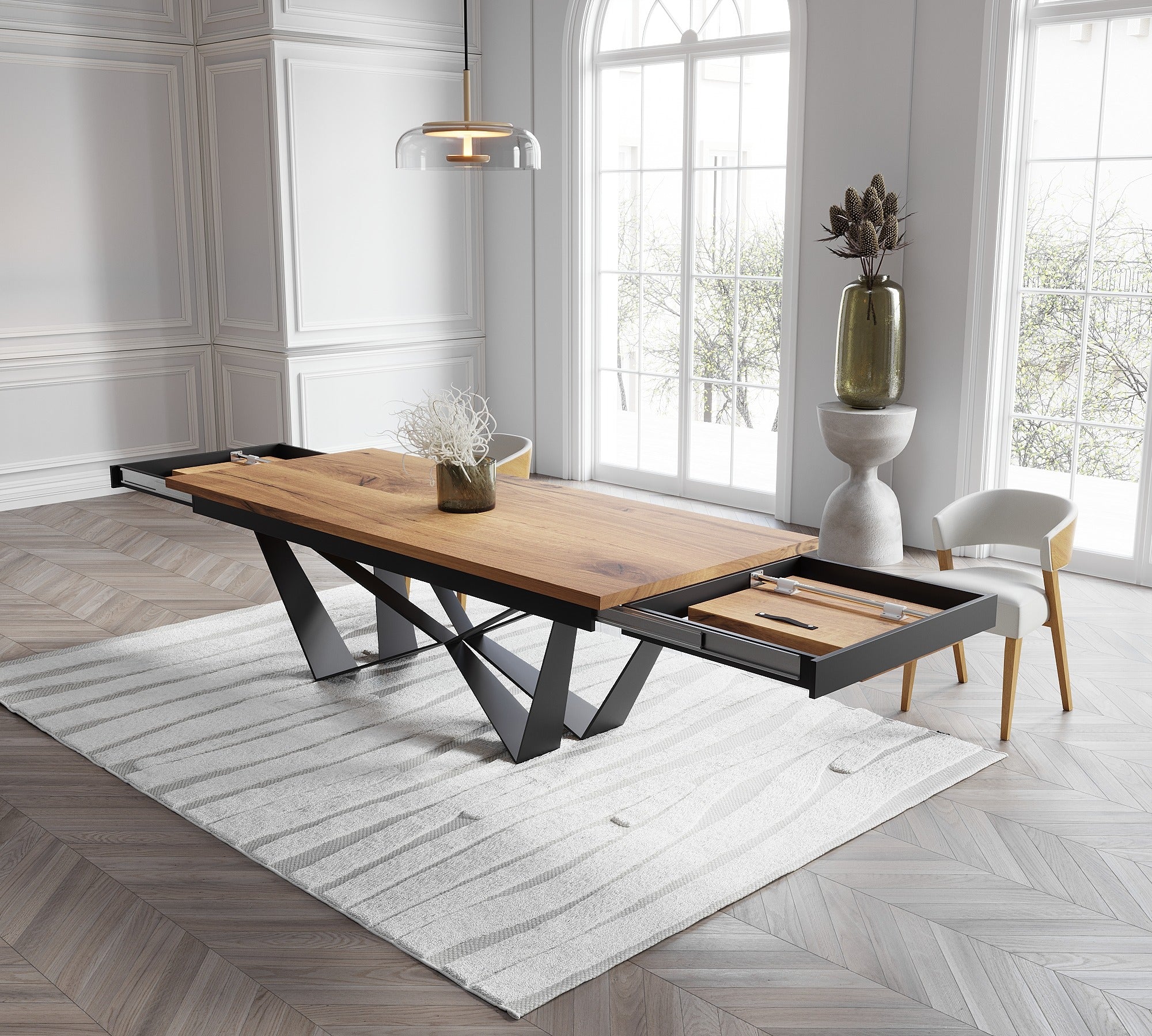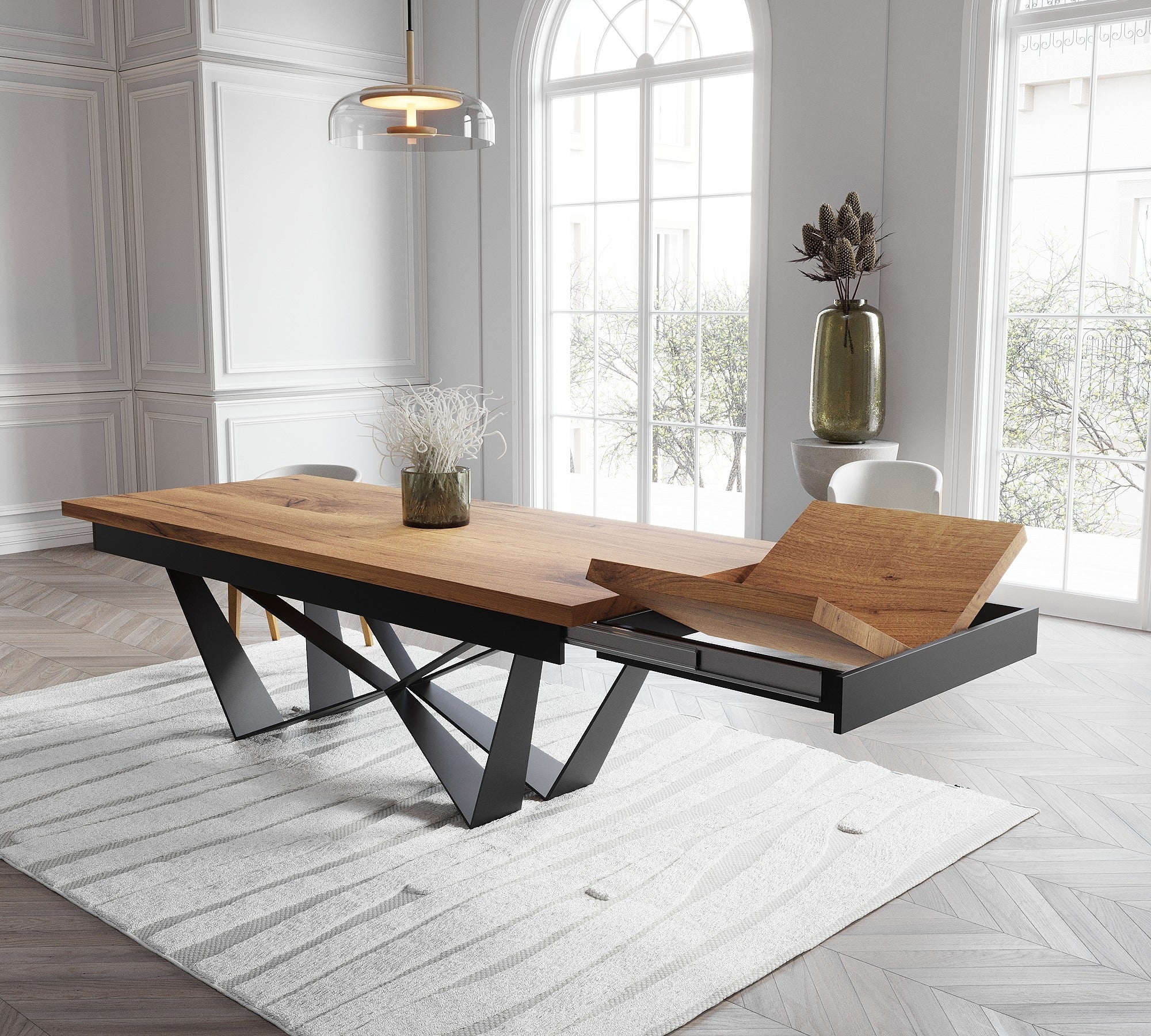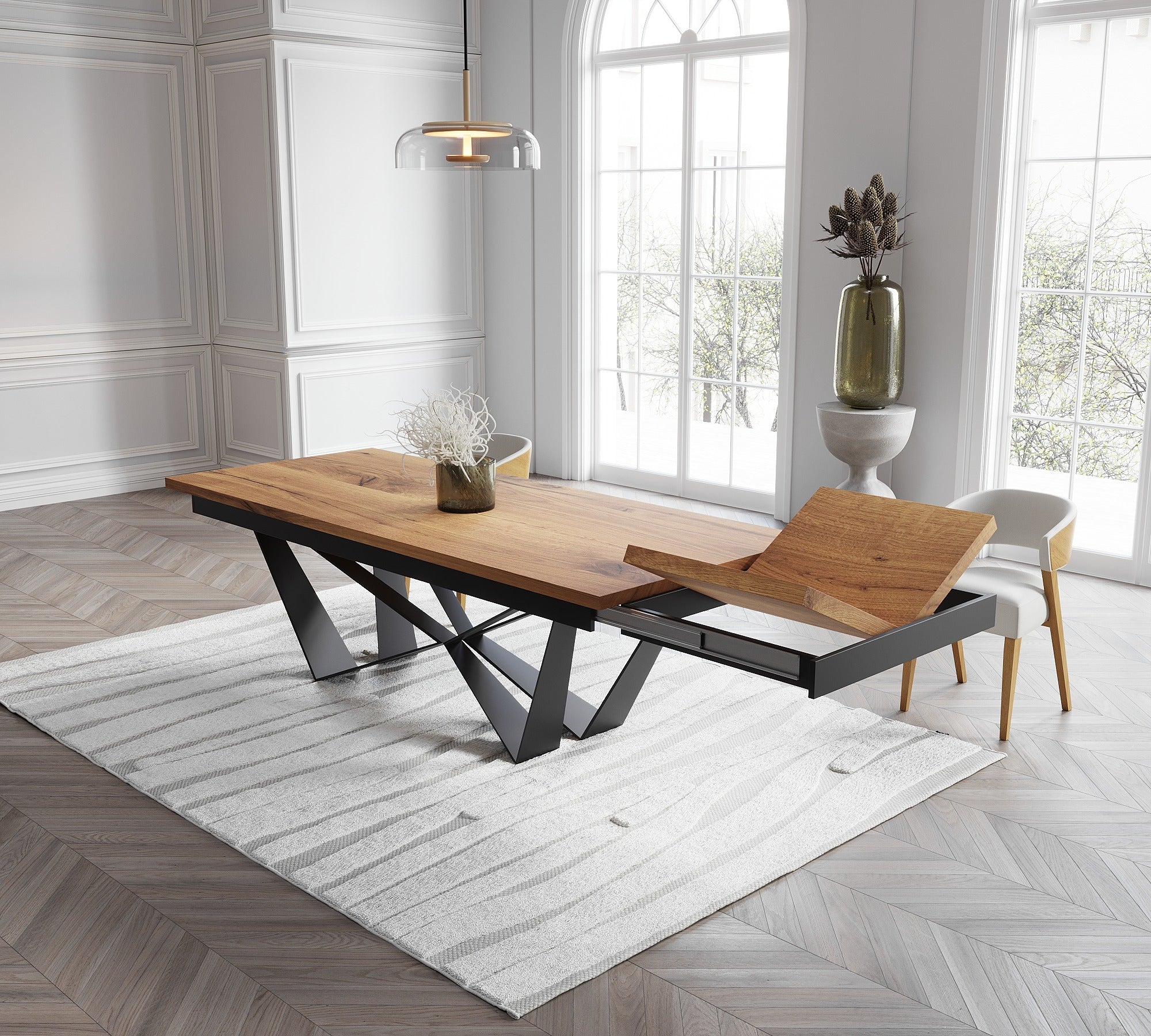 Extendable Solid Oak Dining Table with Scorpio Steel Base