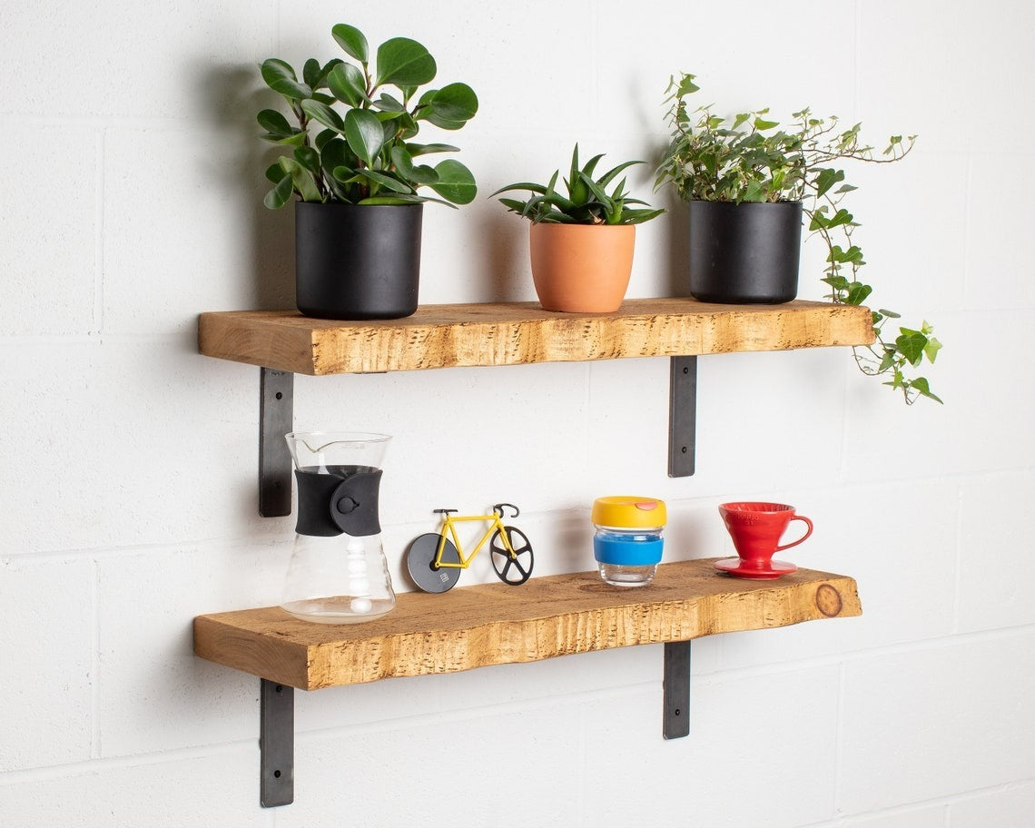 This shelf is supplied with two steel brackets along with screws, rawl plugs, 3mm drill bit & fitting instructions. Our shelf brackets come unattached, this allows you to customise exactly where you want to fix the brackets. Each shelf can hold up to 35kg. These shelves come with two brackets per shelf unless you order 130cm/140cm or 150cm which come with three fixing brackets for extra strength. The fixings supplied are only suitable for solid walls. For plasterboard wall installation you will need to source the correct plasterboard fixings.